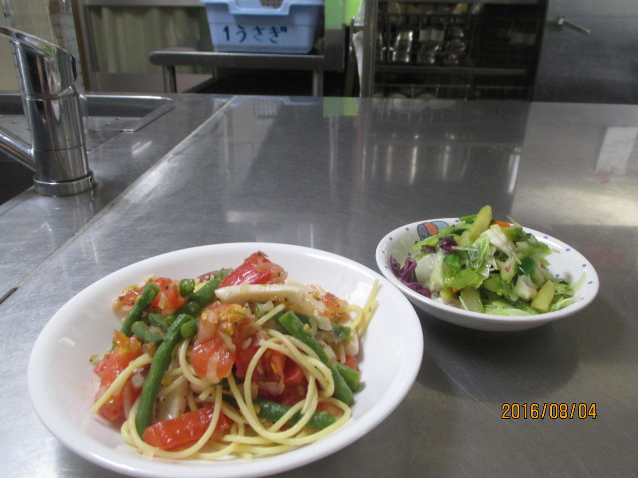 レタスとキャベツをちぎって、キュウリはなんと!包丁でトントンざくざく切って保育園中のみんなのサラダを作ってくれました。大小さまざまな形のキュウリでしたがとってもおいしいサラダが出来ました!