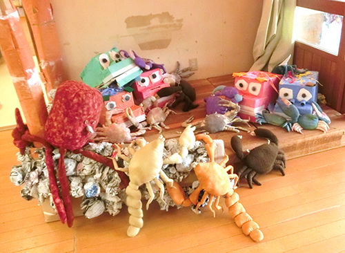 あんぱるぬ浜からひばり組に次々かにがやってきて仲間がそろったところで”まれどしいわい”となりました。(お祝いと称してクッキングをしました)